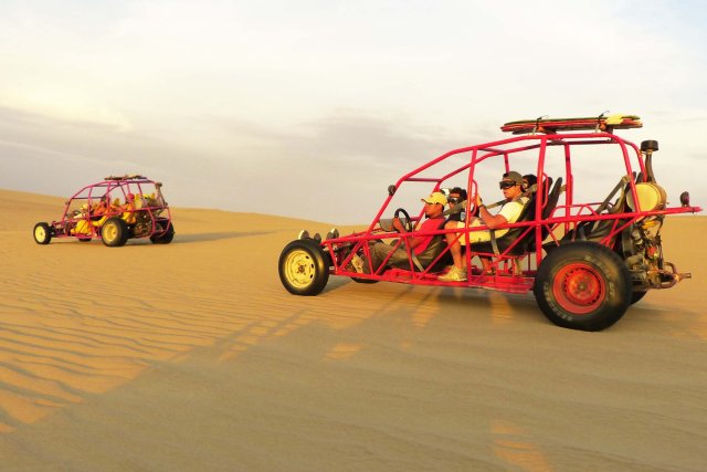 La mejor parte del día. Llegada al Oasis de la Huacachina, conocido como el Oasis de América, donde realizaremos el deporte de aventura con carros areneros (buggies), subiendo y bajando las dunas de Ica a una gran velocidad, nos hará sentir la sensación de estar en una montaña rusa en la arena. Una vez llegada a la cima, nos deslizaremos cuesta abajo mediante una tabla arenera, este deporte de aventura es conocido como Sandboarding. Luego, tendrán tiempo libre para pasear en los alrededores del oasis.